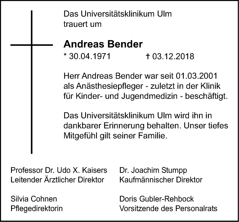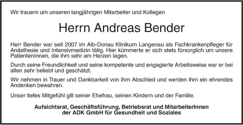 Hier finden Sie alle Traueranzeigen aus der Zeitung, die bisher für Andreas Bender erschienen sind. Weitere Traueranzeigen, die in der Zeitung erscheinen, werden hier ebenfalls aufgelistet