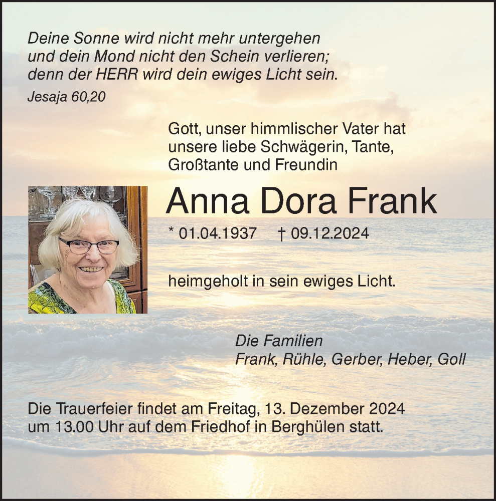 Hier finden Sie alle Traueranzeigen aus der Zeitung, die bisher für Anna Dora Frank erschienen sind. Weitere Traueranzeigen, die in der Zeitung erscheinen, werden hier ebenfalls aufgelistet