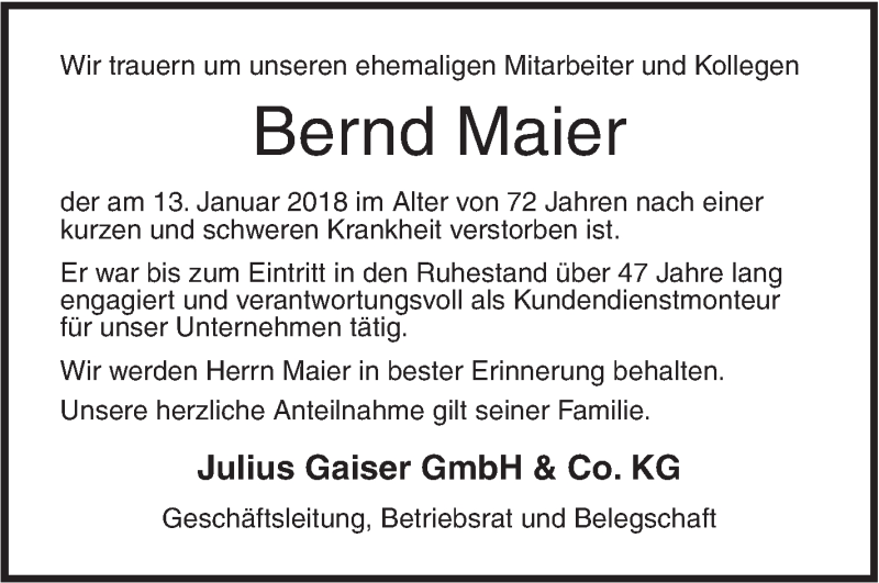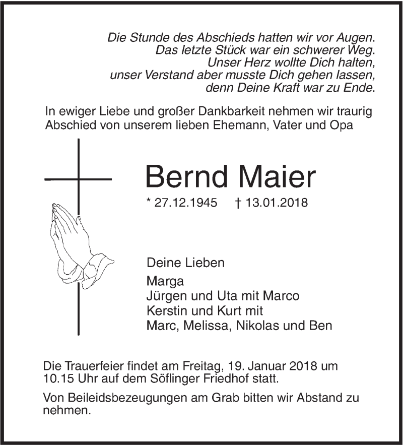 Hier finden Sie alle Traueranzeigen aus der Zeitung, die bisher für Bernd Maier erschienen sind. Weitere Traueranzeigen, die in der Zeitung erscheinen, werden hier ebenfalls aufgelistet