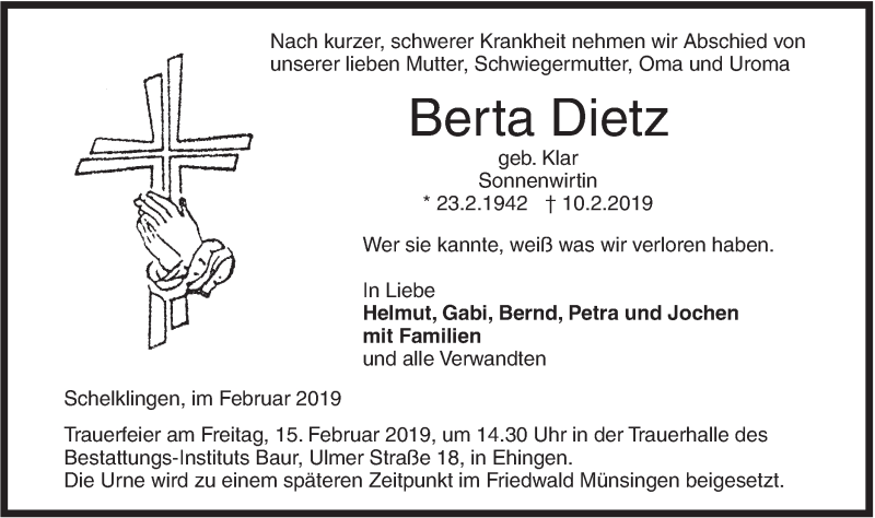 Hier finden Sie alle Traueranzeigen aus der Zeitung, die bisher für Berta Dietz erschienen sind. Weitere Traueranzeigen, die in der Zeitung erscheinen, werden hier ebenfalls aufgelistet