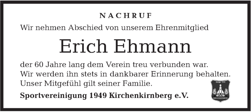 Hier finden Sie alle Traueranzeigen aus der Zeitung, die bisher für Erich Ehmann erschienen sind. Weitere Traueranzeigen, die in der Zeitung erscheinen, werden hier ebenfalls aufgelistet
