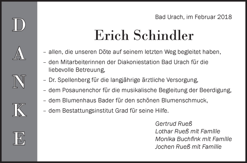 Hier finden Sie alle Traueranzeigen aus der Zeitung, die bisher für Erich Schindler erschienen sind. Weitere Traueranzeigen, die in der Zeitung erscheinen, werden hier ebenfalls aufgelistet