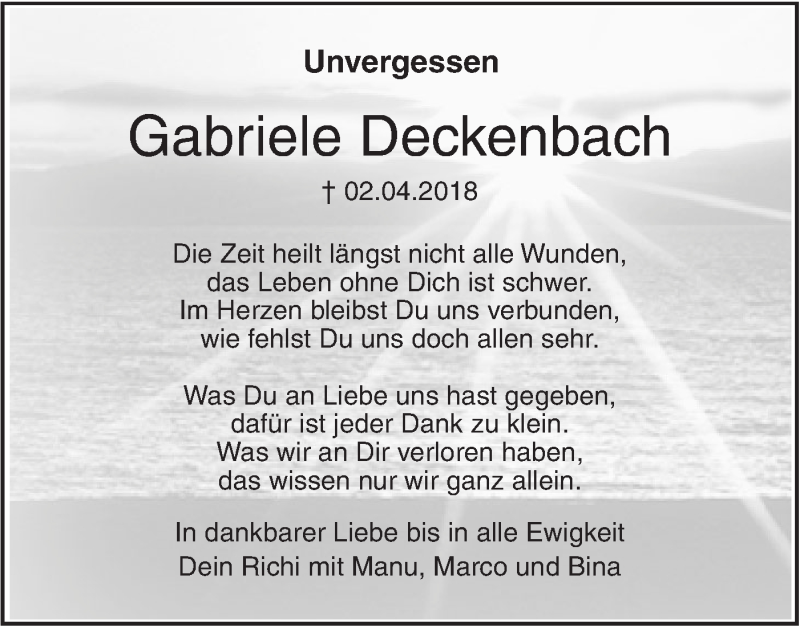 Hier finden Sie alle Traueranzeigen aus der Zeitung, die bisher für Gabriele Deckenbach erschienen sind. Weitere Traueranzeigen, die in der Zeitung erscheinen, werden hier ebenfalls aufgelistet