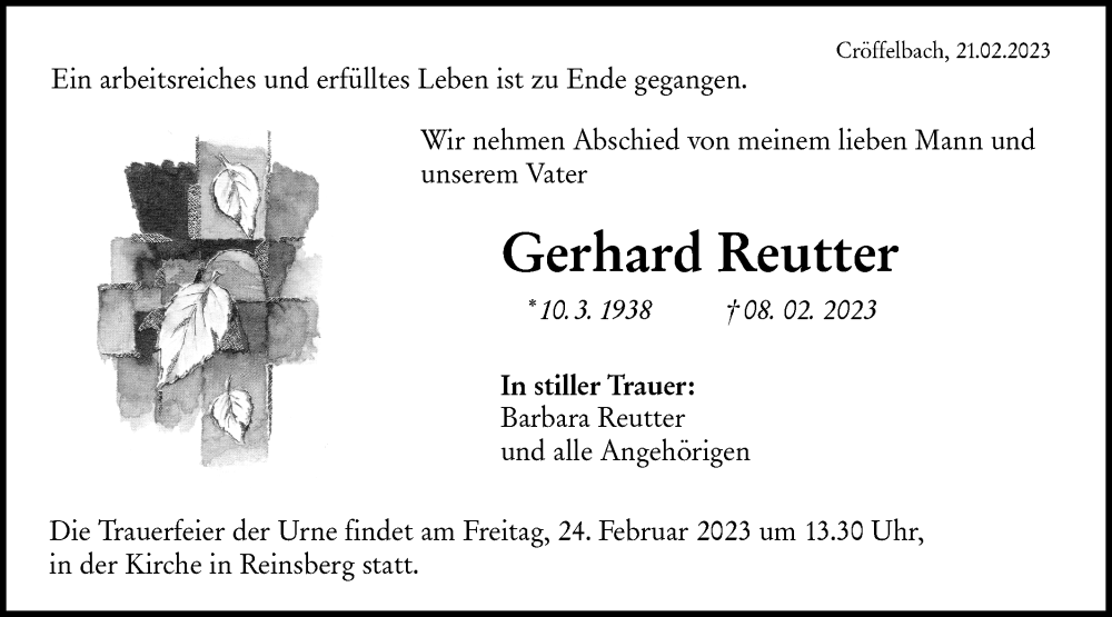 Hier finden Sie alle Traueranzeigen aus der Zeitung, die bisher für Gerhard Reutter erschienen sind. Weitere Traueranzeigen, die in der Zeitung erscheinen, werden hier ebenfalls aufgelistet