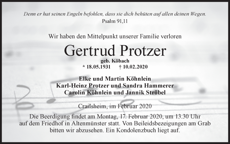 Hier finden Sie alle Traueranzeigen aus der Zeitung, die bisher für Gertrud Protzer erschienen sind. Weitere Traueranzeigen, die in der Zeitung erscheinen, werden hier ebenfalls aufgelistet