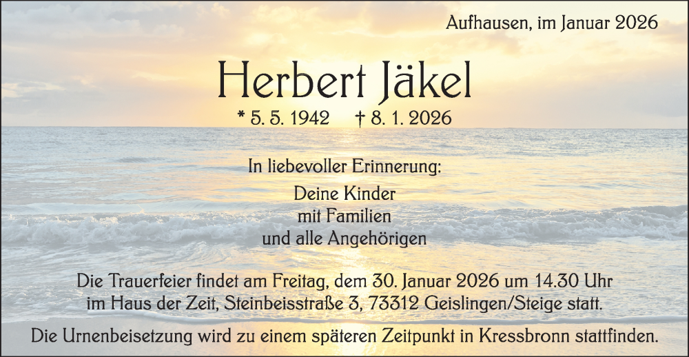 Hier finden Sie alle Traueranzeigen aus der Zeitung, die bisher für Herbert Jäkel erschienen sind. Weitere Traueranzeigen, die in der Zeitung erscheinen, werden hier ebenfalls aufgelistet