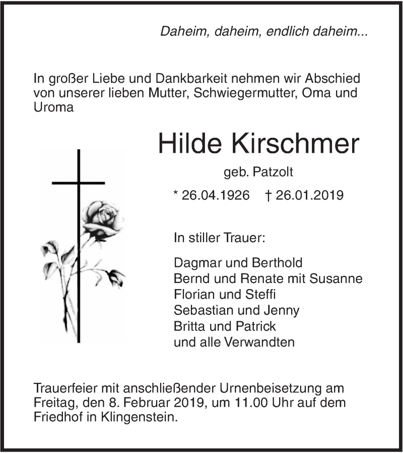 Hier finden Sie alle Traueranzeigen aus der Zeitung, die bisher für Hilde Kirschmer erschienen sind. Weitere Traueranzeigen, die in der Zeitung erscheinen, werden hier ebenfalls aufgelistet