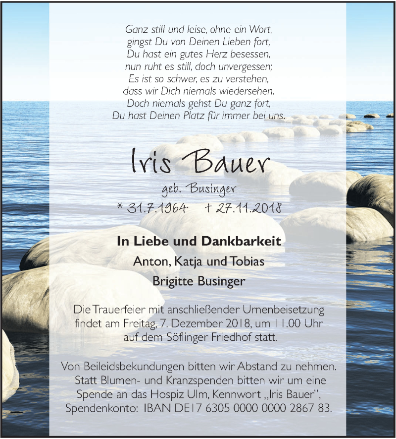 Hier finden Sie alle Traueranzeigen aus der Zeitung, die bisher für Iris Bauer erschienen sind. Weitere Traueranzeigen, die in der Zeitung erscheinen, werden hier ebenfalls aufgelistet