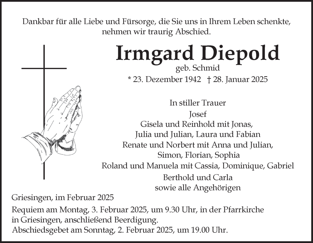 Hier finden Sie alle Traueranzeigen aus der Zeitung, die bisher für Irmgard Diepold erschienen sind. Weitere Traueranzeigen, die in der Zeitung erscheinen, werden hier ebenfalls aufgelistet