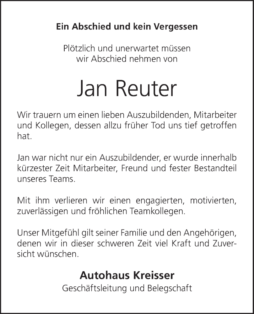 Hier finden Sie alle Traueranzeigen aus der Zeitung, die bisher für Jan Reuter erschienen sind. Weitere Traueranzeigen, die in der Zeitung erscheinen, werden hier ebenfalls aufgelistet