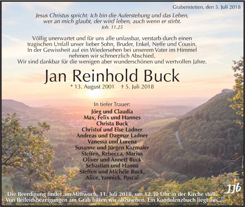 Hier finden Sie alle Traueranzeigen aus der Zeitung, die bisher für Jan Reinhold Buck erschienen sind. Weitere Traueranzeigen, die in der Zeitung erscheinen, werden hier ebenfalls aufgelistet