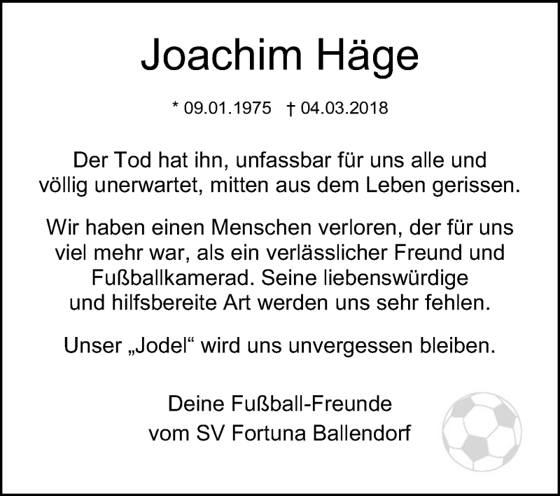 Hier finden Sie alle Traueranzeigen aus der Zeitung, die bisher für Joachim Häge erschienen sind. Weitere Traueranzeigen, die in der Zeitung erscheinen, werden hier ebenfalls aufgelistet