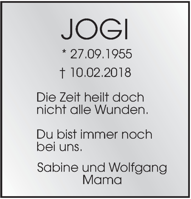 Hier finden Sie alle Traueranzeigen aus der Zeitung, die bisher für Jogi erschienen sind. Weitere Traueranzeigen, die in der Zeitung erscheinen, werden hier ebenfalls aufgelistet