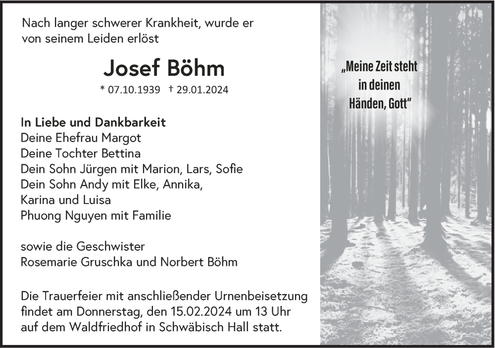 Hier finden Sie alle Traueranzeigen aus der Zeitung, die bisher für Josef Böhm erschienen sind. Weitere Traueranzeigen, die in der Zeitung erscheinen, werden hier ebenfalls aufgelistet