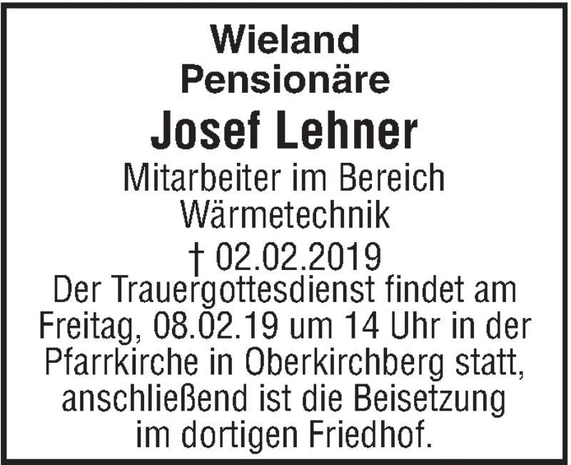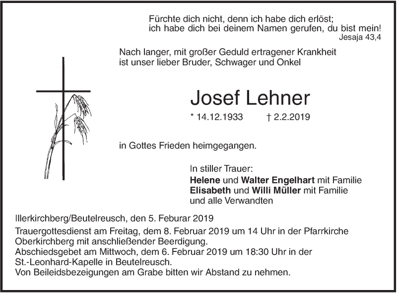 Hier finden Sie alle Traueranzeigen aus der Zeitung, die bisher für Josef Lehner erschienen sind. Weitere Traueranzeigen, die in der Zeitung erscheinen, werden hier ebenfalls aufgelistet