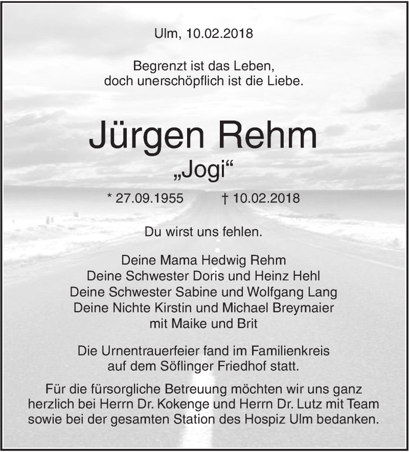 Hier finden Sie alle Traueranzeigen aus der Zeitung, die bisher für Jürgen Rehm erschienen sind. Weitere Traueranzeigen, die in der Zeitung erscheinen, werden hier ebenfalls aufgelistet