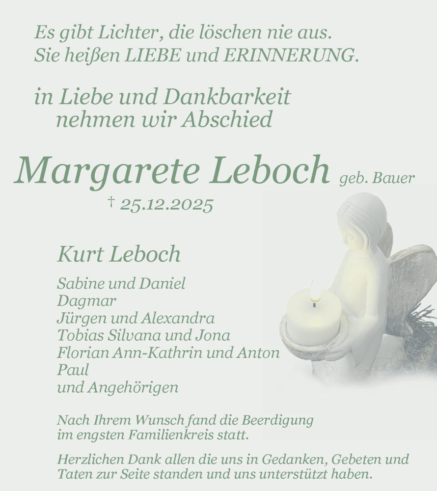 Hier finden Sie alle Traueranzeigen aus der Zeitung, die bisher für Margarete Leboch erschienen sind. Weitere Traueranzeigen, die in der Zeitung erscheinen, werden hier ebenfalls aufgelistet