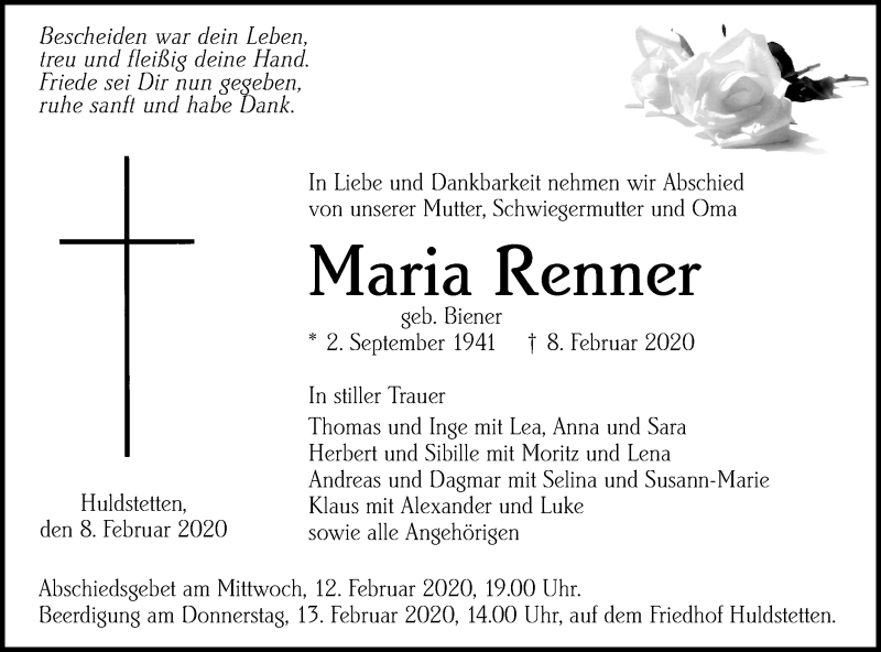 Hier finden Sie alle Traueranzeigen aus der Zeitung, die bisher für Maria Renner erschienen sind. Weitere Traueranzeigen, die in der Zeitung erscheinen, werden hier ebenfalls aufgelistet