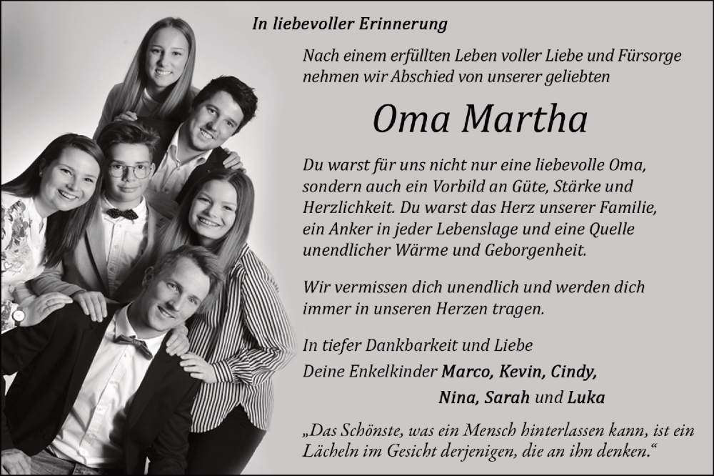 Hier finden Sie alle Traueranzeigen aus der Zeitung, die bisher für Martha erschienen sind. Weitere Traueranzeigen, die in der Zeitung erscheinen, werden hier ebenfalls aufgelistet