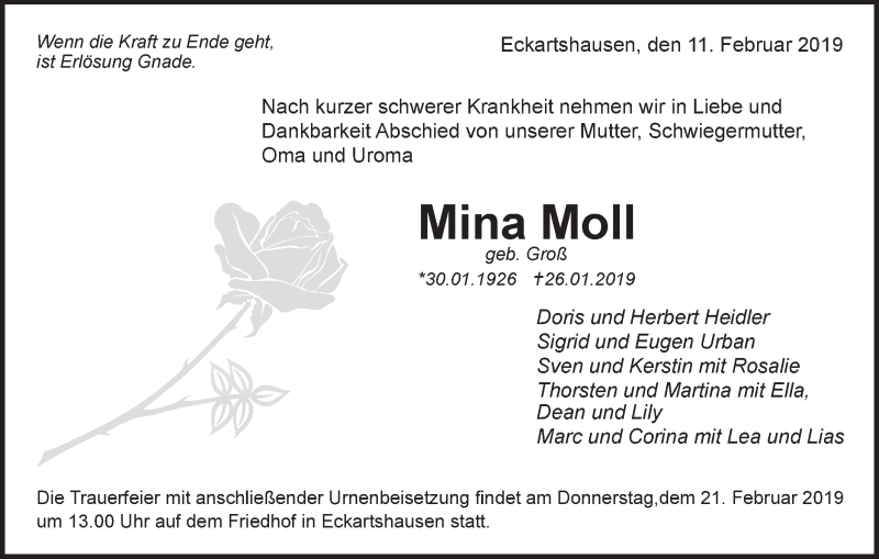 Hier finden Sie alle Traueranzeigen aus der Zeitung, die bisher für Mina Moll erschienen sind. Weitere Traueranzeigen, die in der Zeitung erscheinen, werden hier ebenfalls aufgelistet