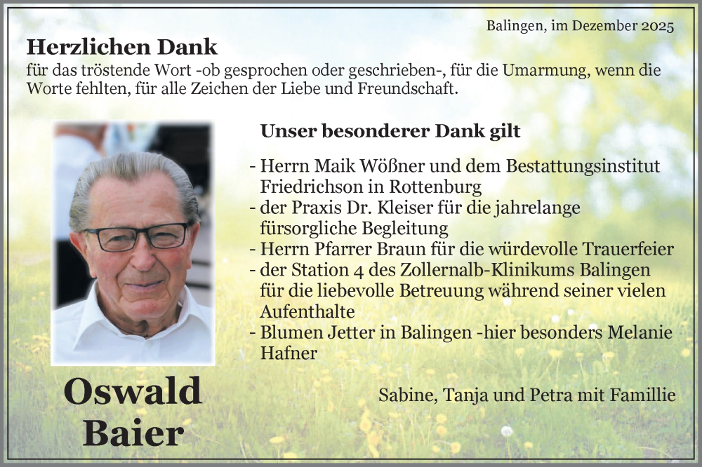 Hier finden Sie alle Traueranzeigen aus der Zeitung, die bisher für Oswald Baier erschienen sind. Weitere Traueranzeigen, die in der Zeitung erscheinen, werden hier ebenfalls aufgelistet