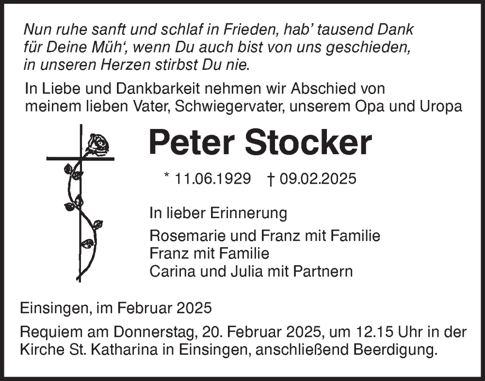 Hier finden Sie alle Traueranzeigen aus der Zeitung, die bisher für Peter Stocker erschienen sind. Weitere Traueranzeigen, die in der Zeitung erscheinen, werden hier ebenfalls aufgelistet