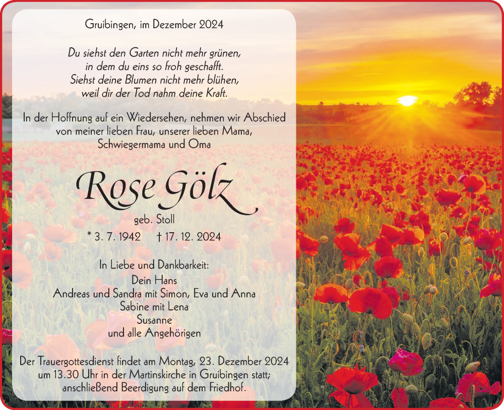Hier finden Sie alle Traueranzeigen aus der Zeitung, die bisher für Rose Gölz erschienen sind. Weitere Traueranzeigen, die in der Zeitung erscheinen, werden hier ebenfalls aufgelistet