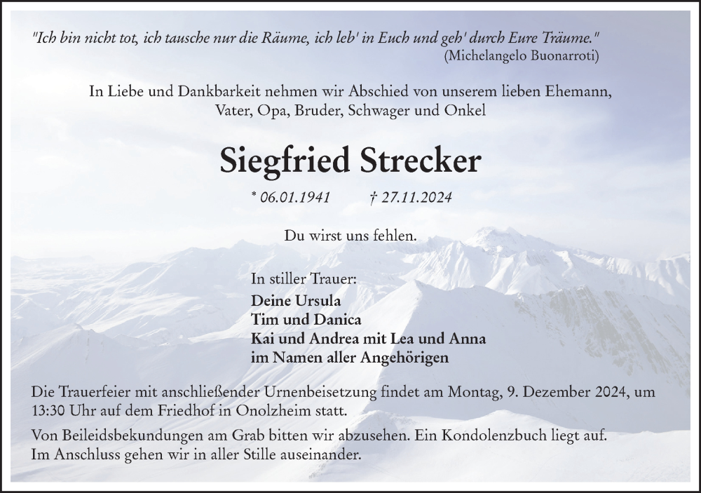 Hier finden Sie alle Traueranzeigen aus der Zeitung, die bisher für Siegfried Strecker erschienen sind. Weitere Traueranzeigen, die in der Zeitung erscheinen, werden hier ebenfalls aufgelistet