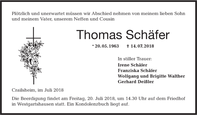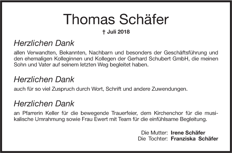 Hier finden Sie alle Traueranzeigen aus der Zeitung, die bisher für Thomas Schäfer erschienen sind. Weitere Traueranzeigen, die in der Zeitung erscheinen, werden hier ebenfalls aufgelistet