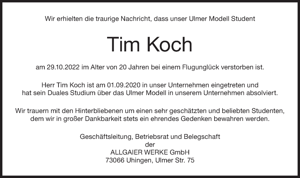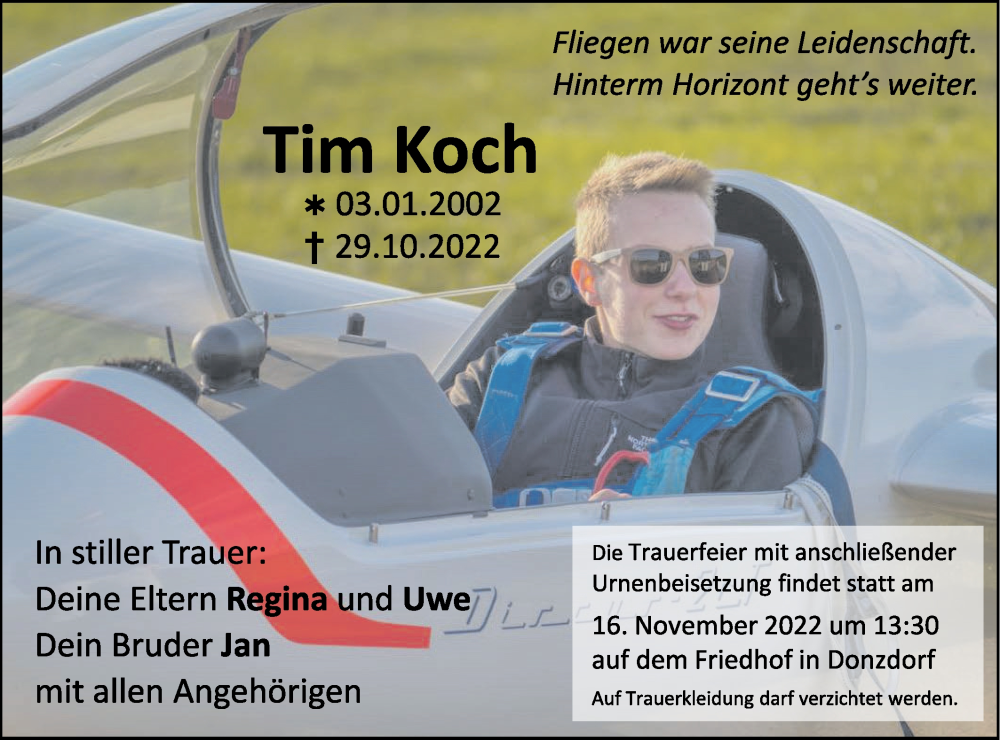 Hier finden Sie alle Traueranzeigen aus der Zeitung, die bisher für Tim Koch erschienen sind. Weitere Traueranzeigen, die in der Zeitung erscheinen, werden hier ebenfalls aufgelistet
