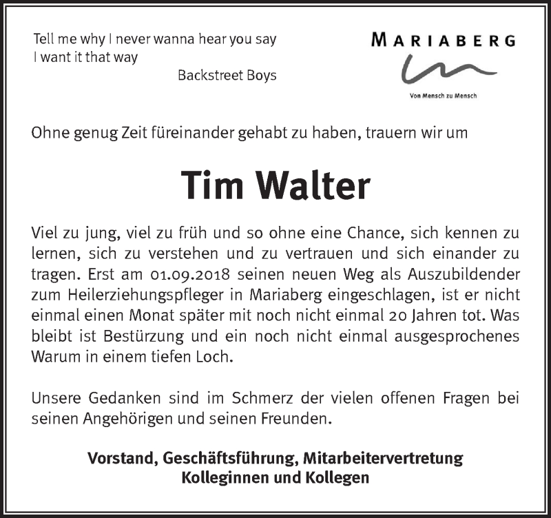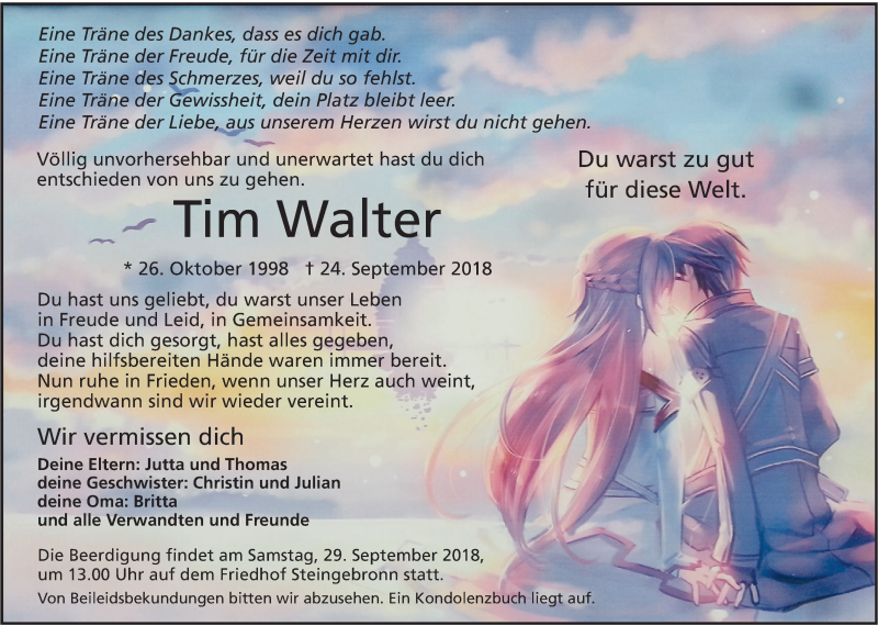 Hier finden Sie alle Traueranzeigen aus der Zeitung, die bisher für Tim Walter erschienen sind. Weitere Traueranzeigen, die in der Zeitung erscheinen, werden hier ebenfalls aufgelistet