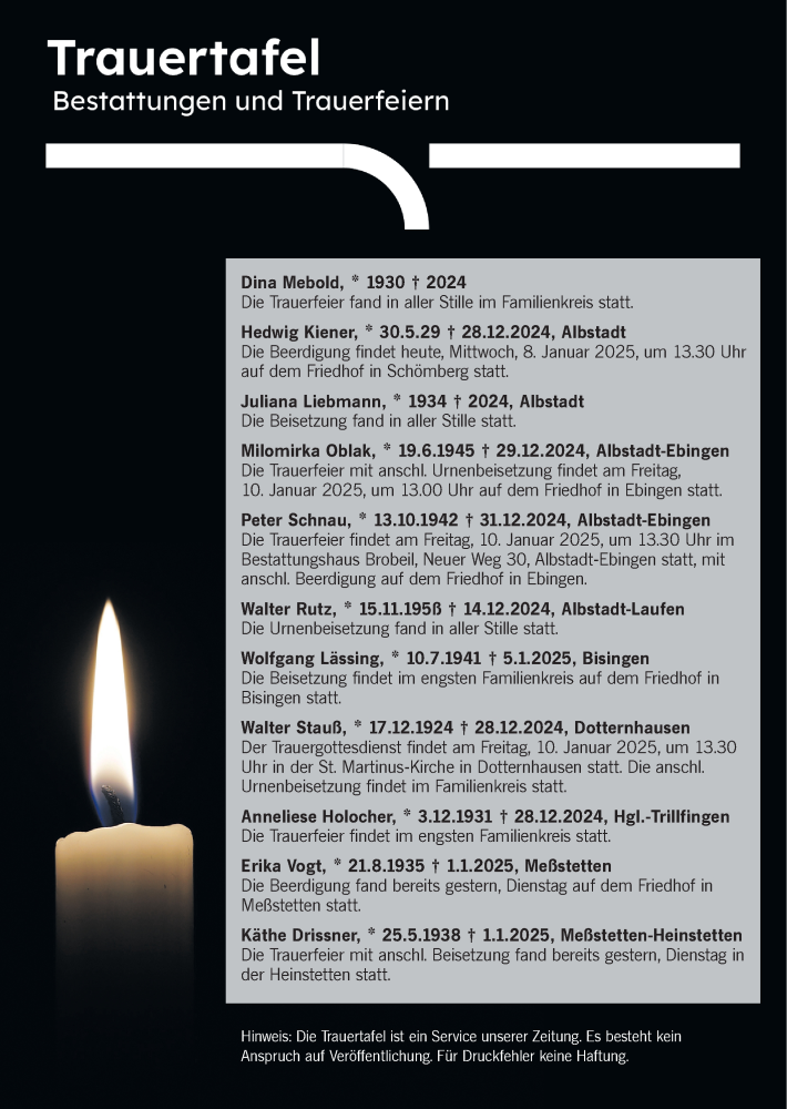 Hier finden Sie alle Traueranzeigen aus der Zeitung, die bisher für Totentafel vom 08.01.2025 erschienen sind. Weitere Traueranzeigen, die in der Zeitung erscheinen, werden hier ebenfalls aufgelistet