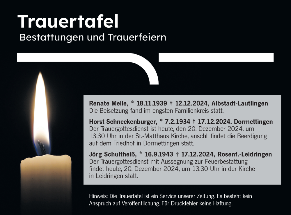 Hier finden Sie alle Traueranzeigen aus der Zeitung, die bisher für Trauertafel erschienen sind. Weitere Traueranzeigen, die in der Zeitung erscheinen, werden hier ebenfalls aufgelistet