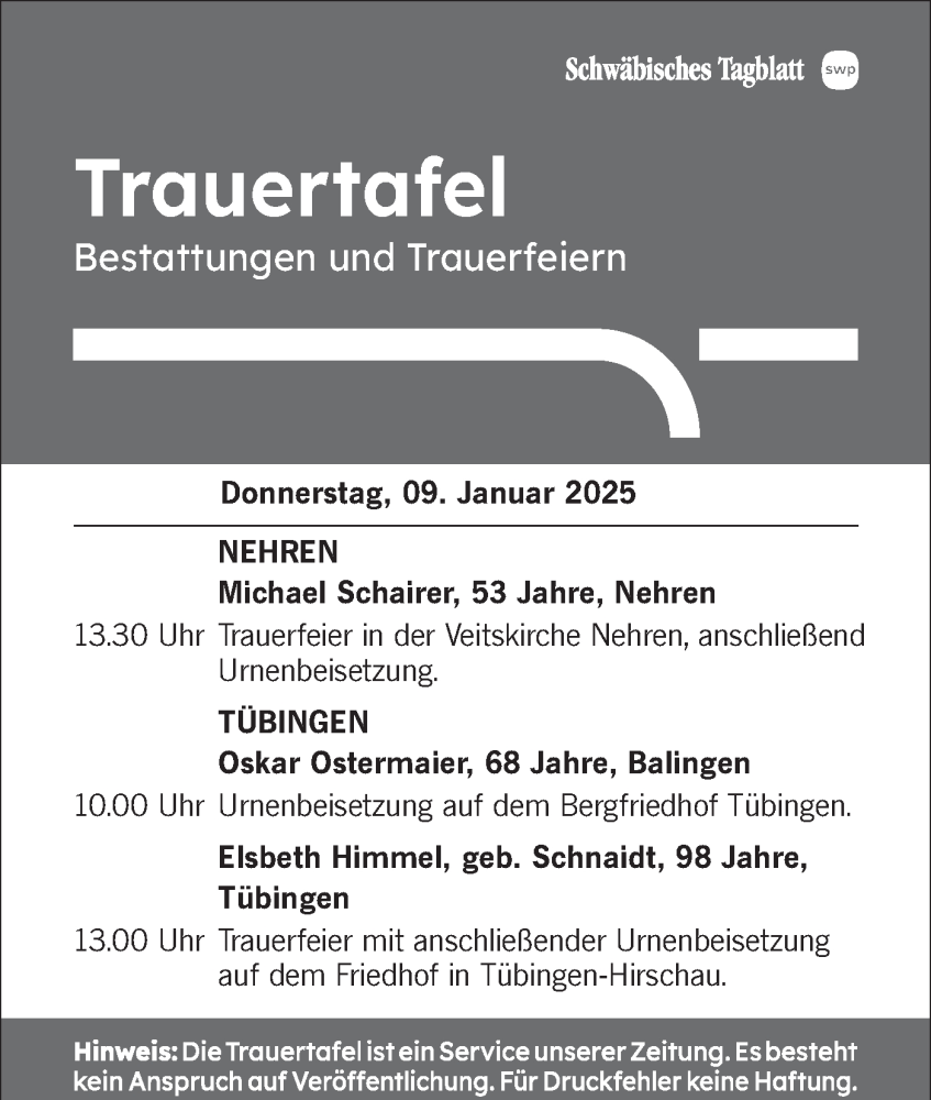 Hier finden Sie alle Traueranzeigen aus der Zeitung, die bisher für Trauertafel vom 09.01.2025 erschienen sind. Weitere Traueranzeigen, die in der Zeitung erscheinen, werden hier ebenfalls aufgelistet