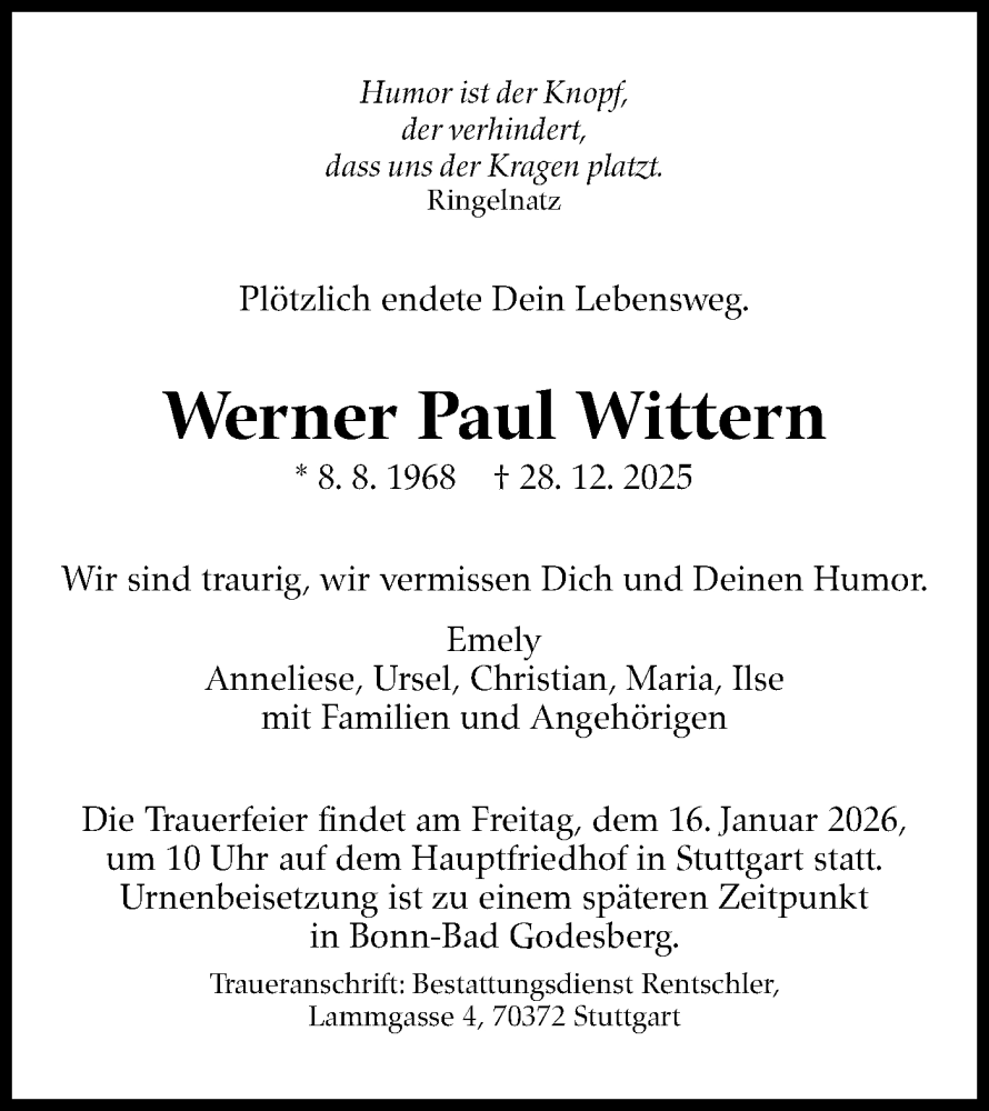 Hier finden Sie alle Traueranzeigen aus der Zeitung, die bisher für Werner Paul Wittern erschienen sind. Weitere Traueranzeigen, die in der Zeitung erscheinen, werden hier ebenfalls aufgelistet