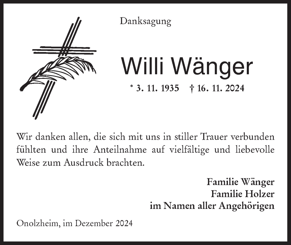 Hier finden Sie alle Traueranzeigen aus der Zeitung, die bisher für Willi Wänger erschienen sind. Weitere Traueranzeigen, die in der Zeitung erscheinen, werden hier ebenfalls aufgelistet