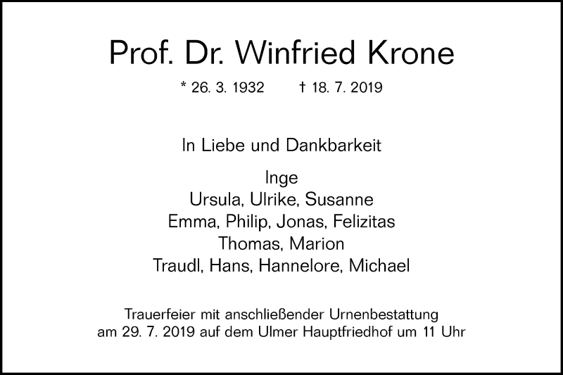 Hier finden Sie alle Traueranzeigen aus der Zeitung, die bisher für Winfried Krone erschienen sind. Weitere Traueranzeigen, die in der Zeitung erscheinen, werden hier ebenfalls aufgelistet